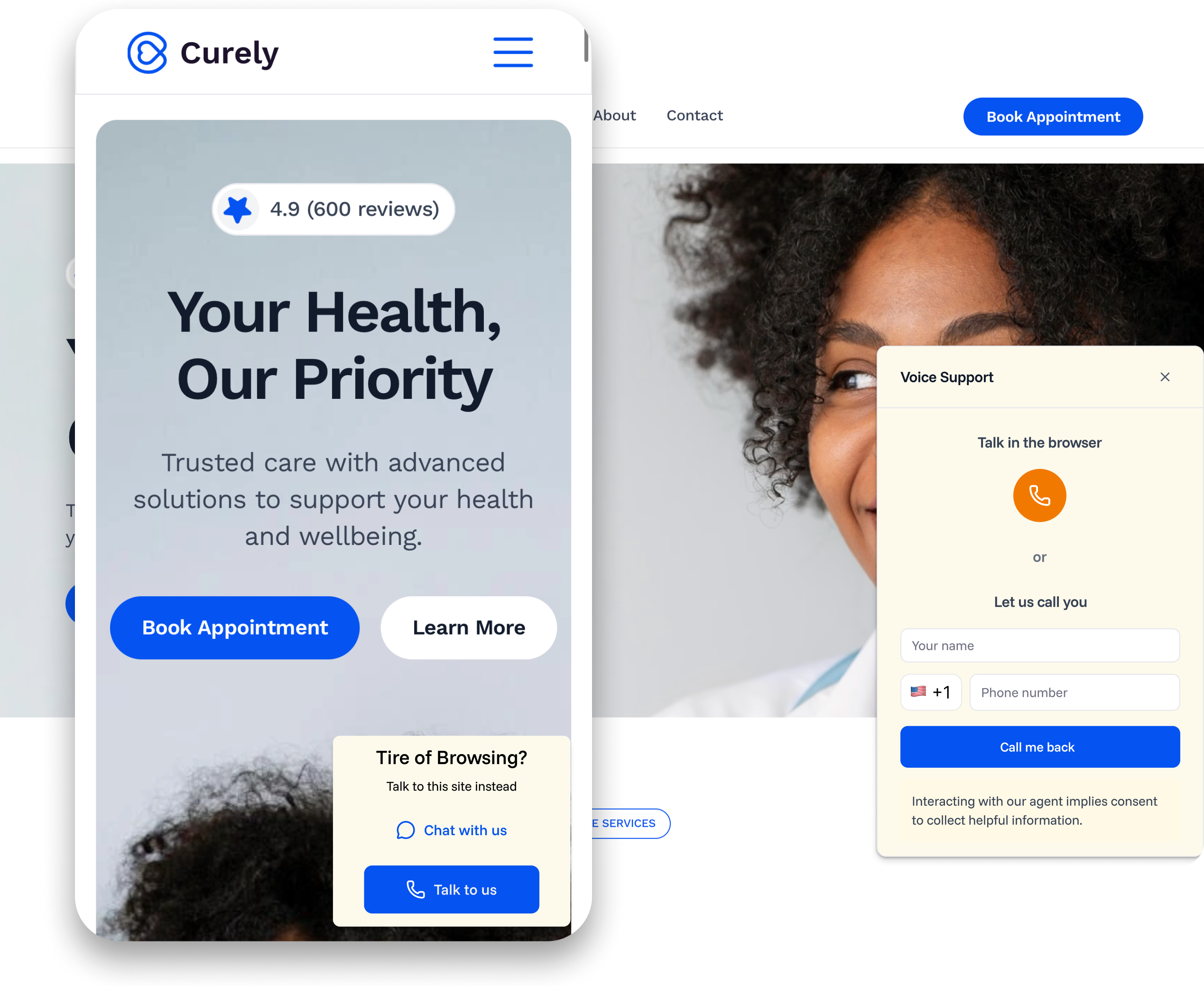 Convert website visitors into patients with instant chat, voice calls, and smart lead collection.